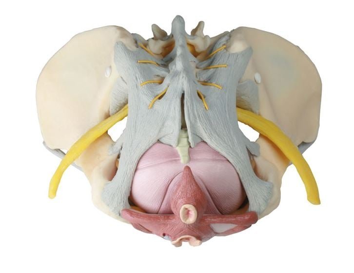 The model is life-size. Female pelvis like 4070, but showing ligaments, nerves and removable 2-part pelvic floor muscles.